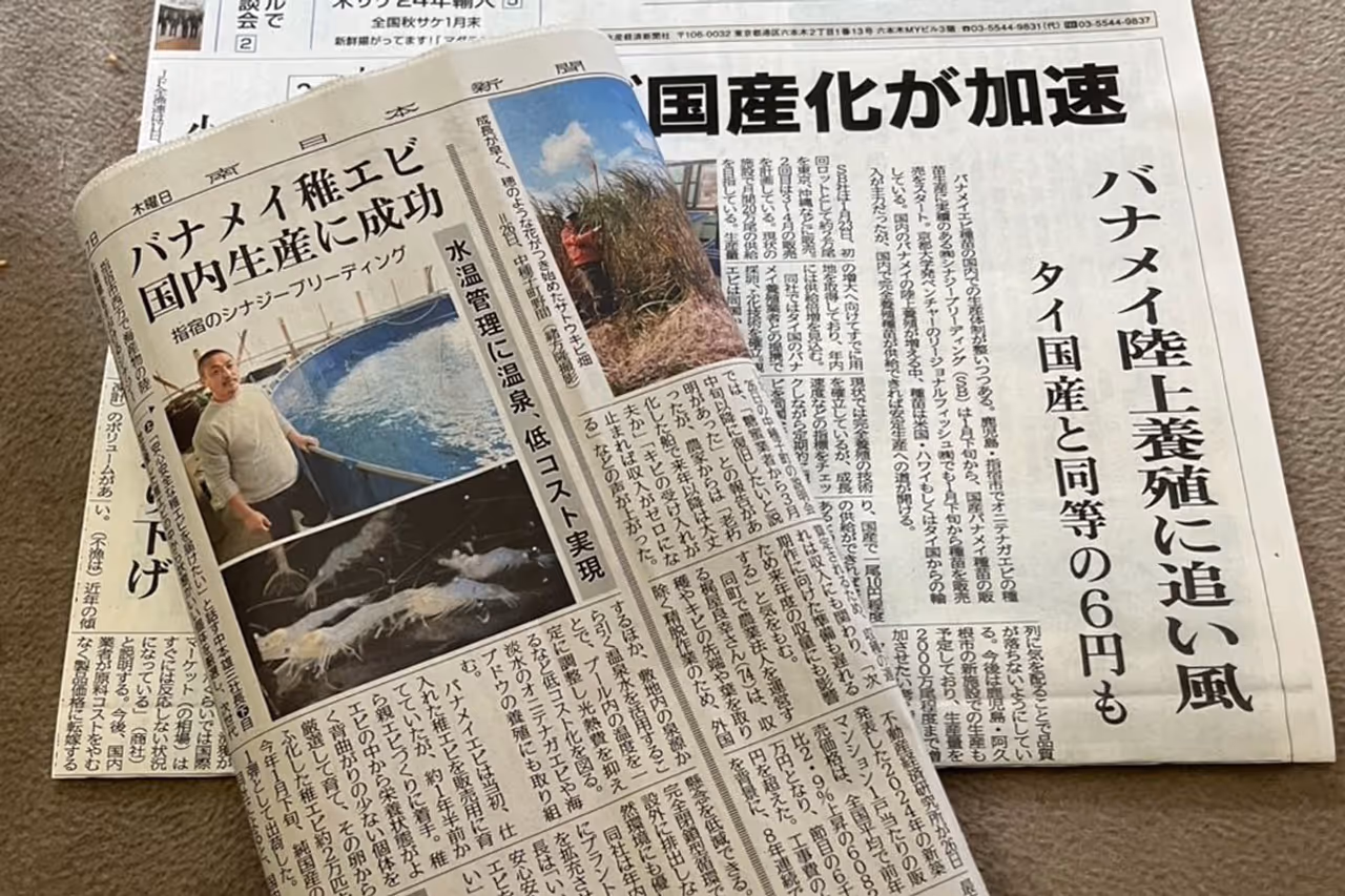 地方新聞のみならず、専門誌にもシナジーの稚海老生産のニュースを取り上げて頂きました。報道に偽りのない事をしっかり証明しながら、安定生産に向けて進んで行きます。